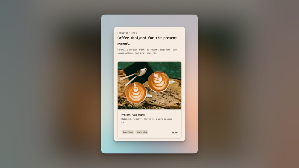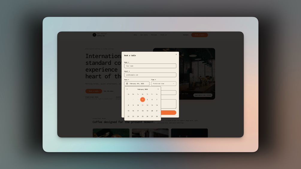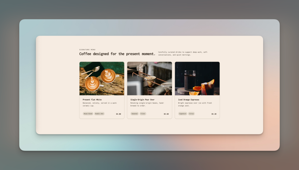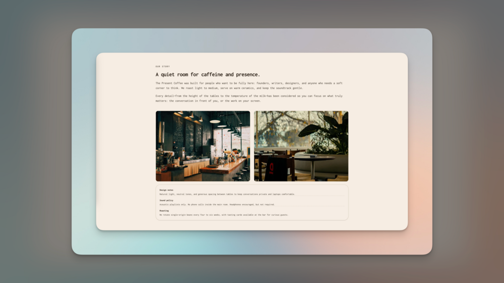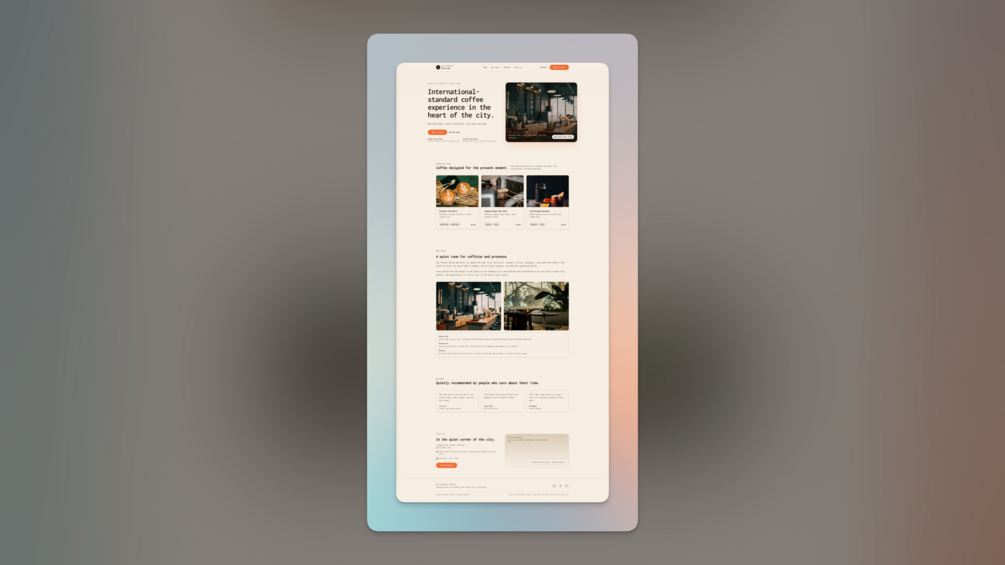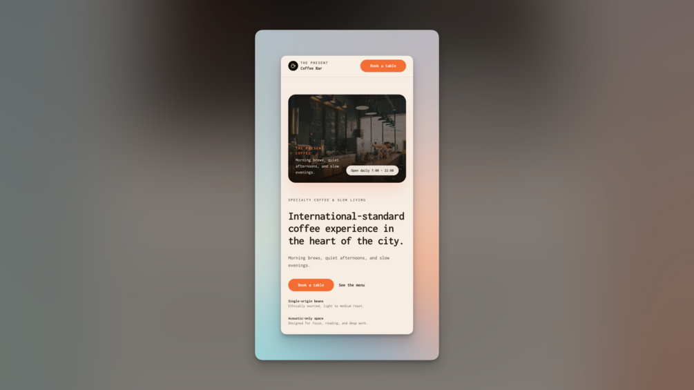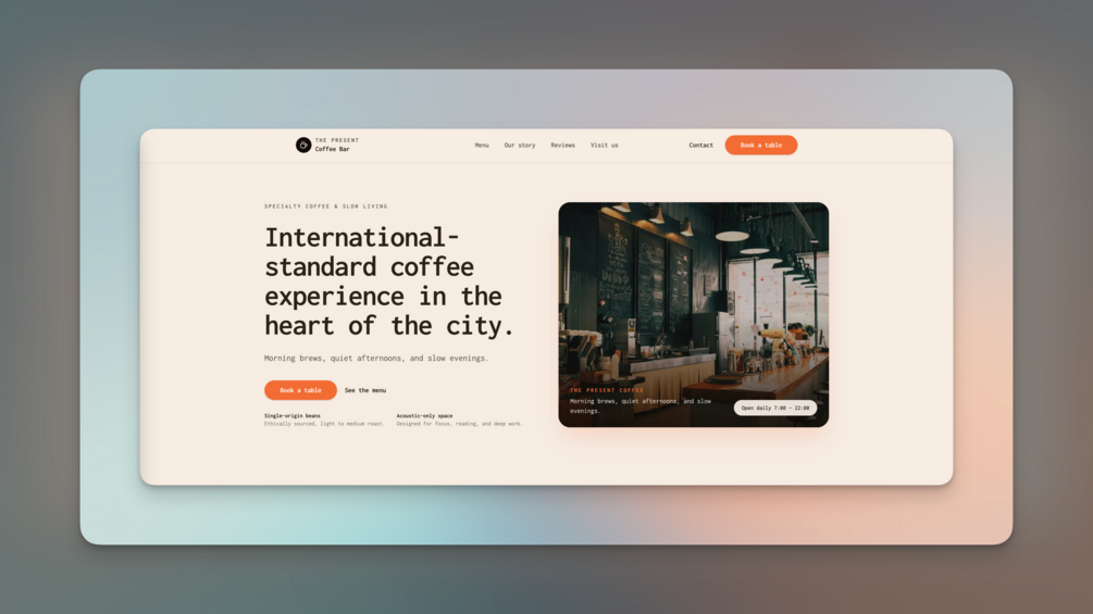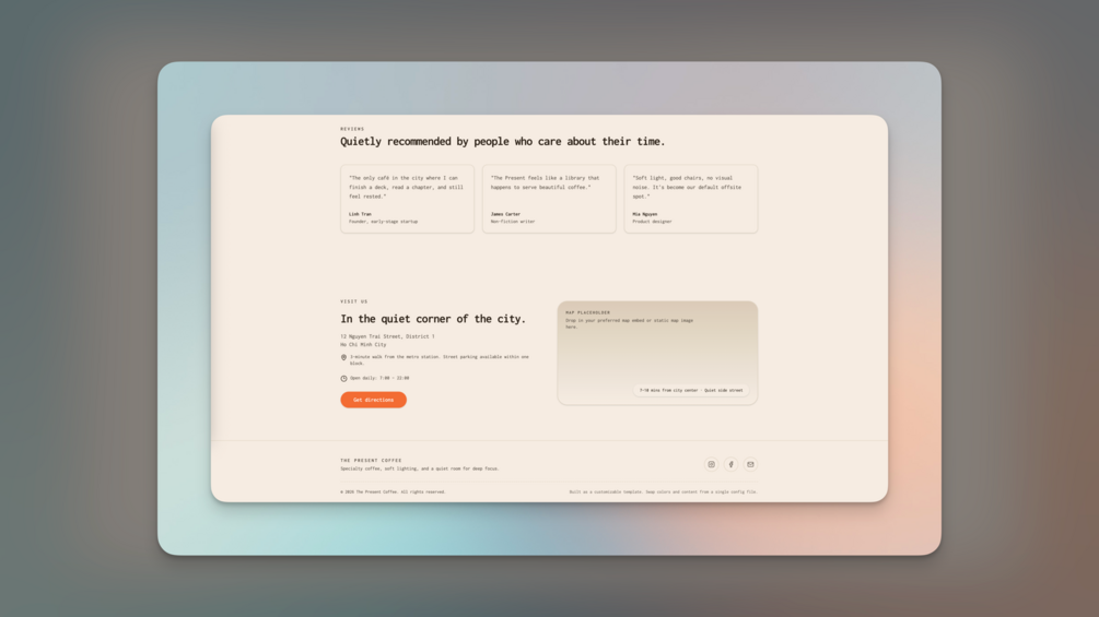 The Present Coffee is a production-ready Next.js 16 landing page template designed for modern coffee shops and hospitality brands.Built with a high-end, minimalist aesthetic, it features a single-file configuration system and a clean, feature-sliced architecture (FSD).